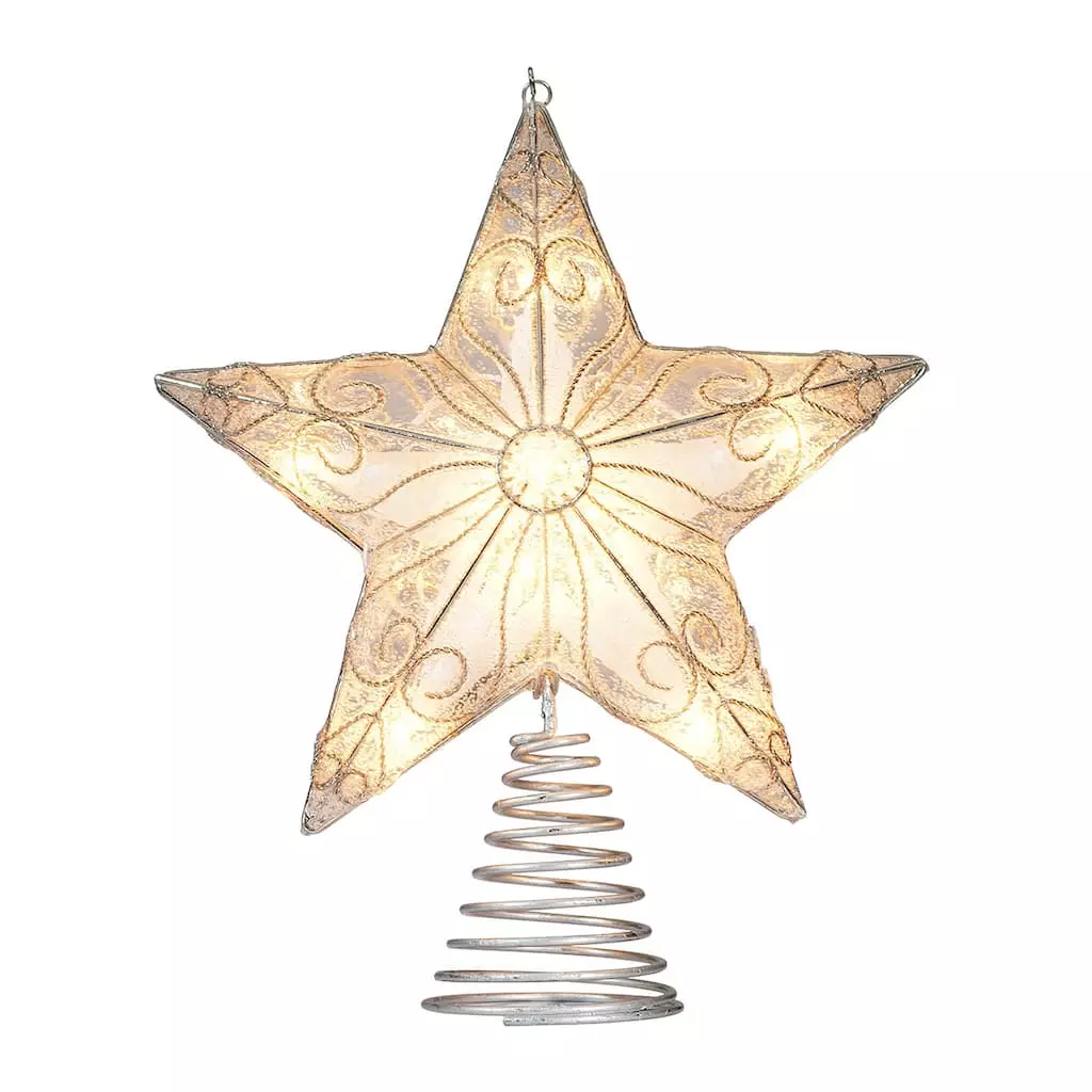 This stunning glittery tree topper will bring a wonderful enchanting glow to your holiday tree. With a lovely star design accented by swirling metal filigree and warm white sparkling LED lights, this piece will give a fantastic, festive finish to your Christmas decorating.