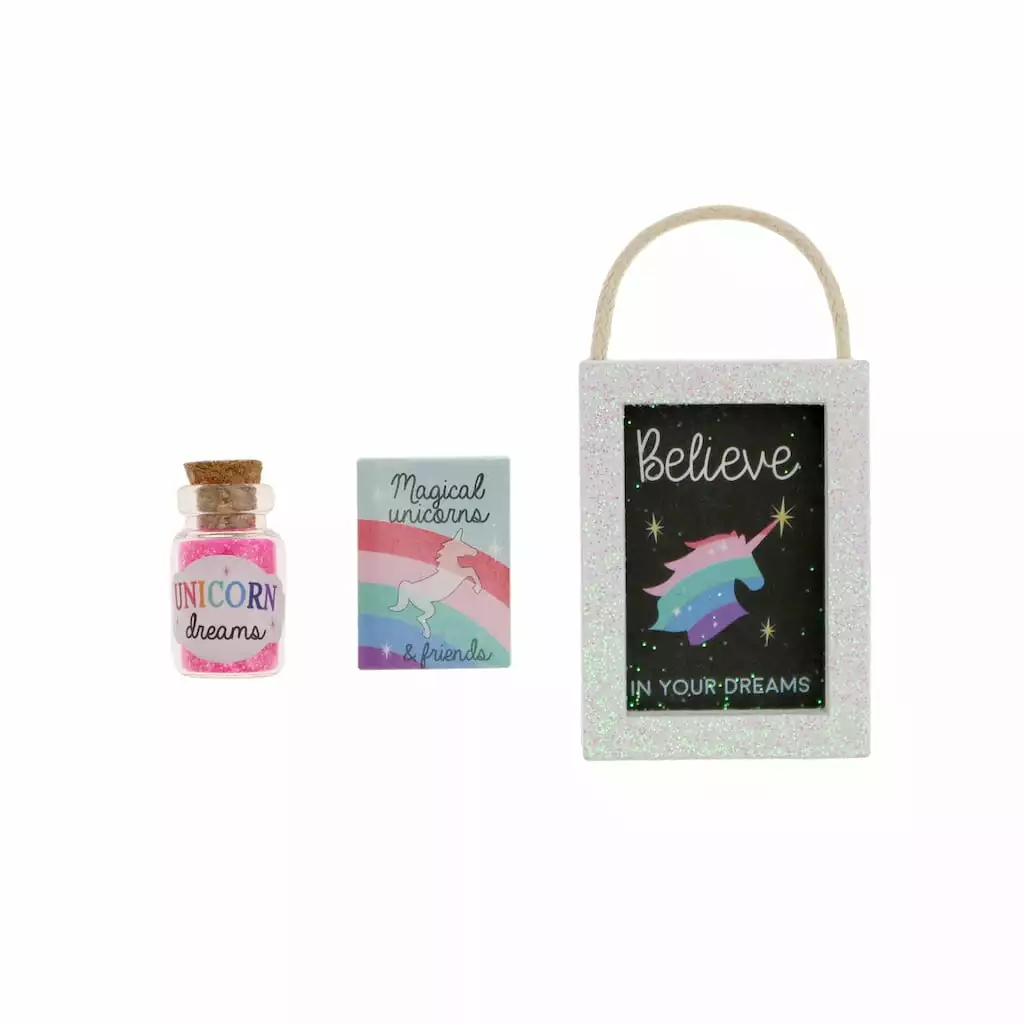Add charm and personality to a dollhouse play room or display box scene for a unicorn fan in your life with this miniature accessory set. Featuring tiny magical details, these pieces will be the perfect finishing touch for your scenery and diorama projects.