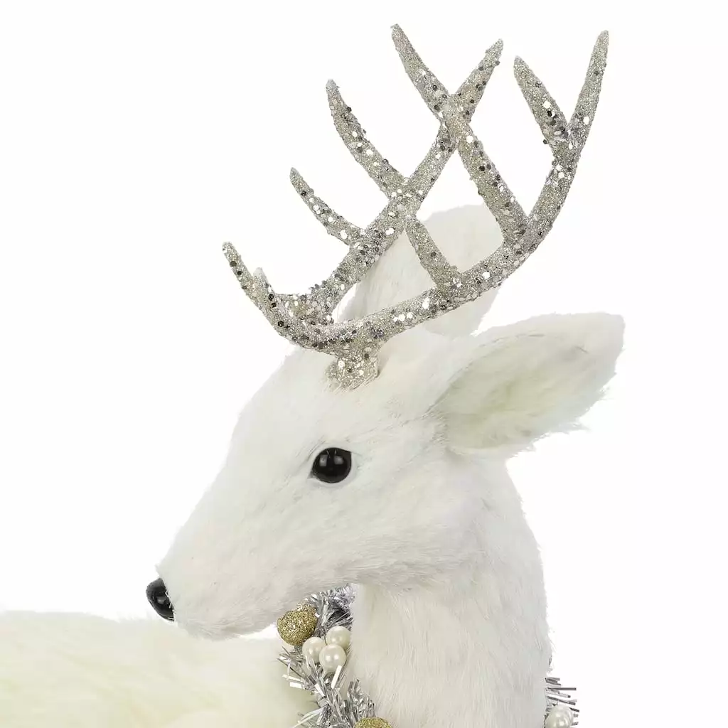 With glittery silver antlers and a wreath of tinsel and ornaments around its neck, this lovely sitting deer figurine is sure to bring festive cheer to your home. Display this charming piece alongside a miniature golden tree decked out in sparkly ornaments on your mantel for the holiday season.