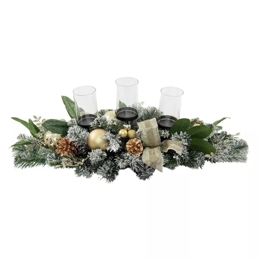 Decorate your dining table with this winter inspired candle holder centerpiece. With its realistic design, this festive mixed pine candleholder will warm up any household. Filled with artificial magnolia leaves, pinecones, and frosted pine needles, this candleholder will be the perfect centerpiece for a lovely family dinner at home or a restaurant.