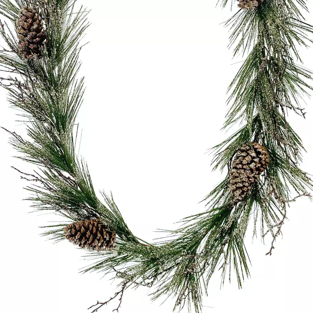 Give your holiday decorating a lovely touch of festive greenery with this snow-dusted garland of lush pine accented with pinecones. Embellish with sparkling clear lights and ribbon or display as is draped over a doorway, window frame, mantel or banister to bring warmth and cheer into your home this Christmas.