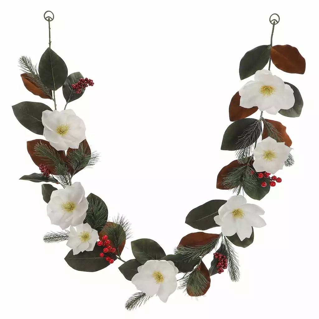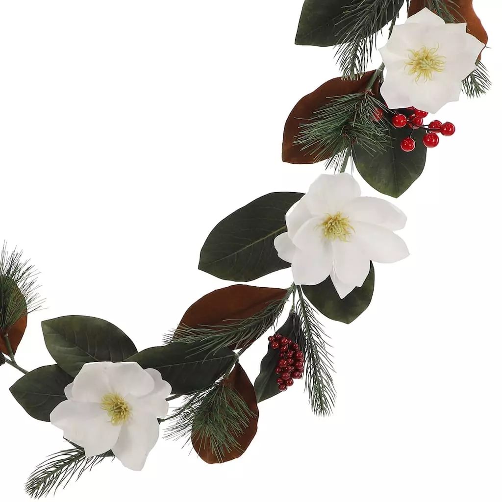 Give your holiday decorating a lovely touch of festive greenery with this garland of large white magnolia blooms and vibrant red berries accented with pine branches. Embellish with sparkling clear lights and ribbon or display as is draped over a doorway, window frame, mantel or bannister to bring warmth and cheer into your home this Christmas.