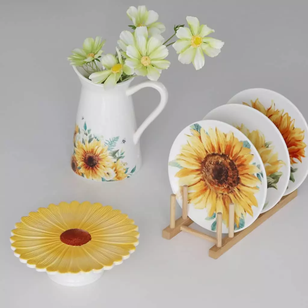 This beautiful sunflower pitcher is perfect for cool fall drinks. Fill it with your preferred cold beverage to serve at festive gatherings.