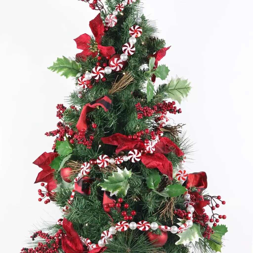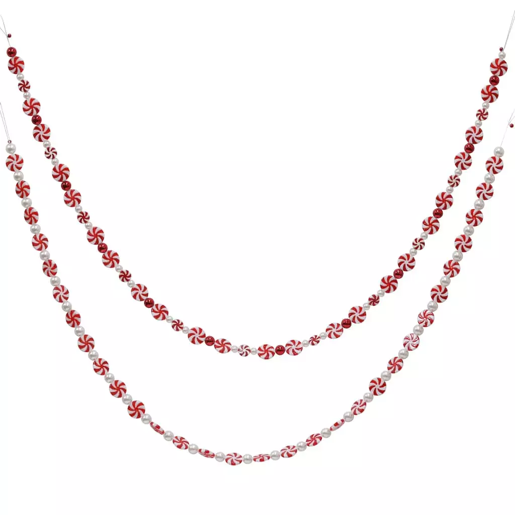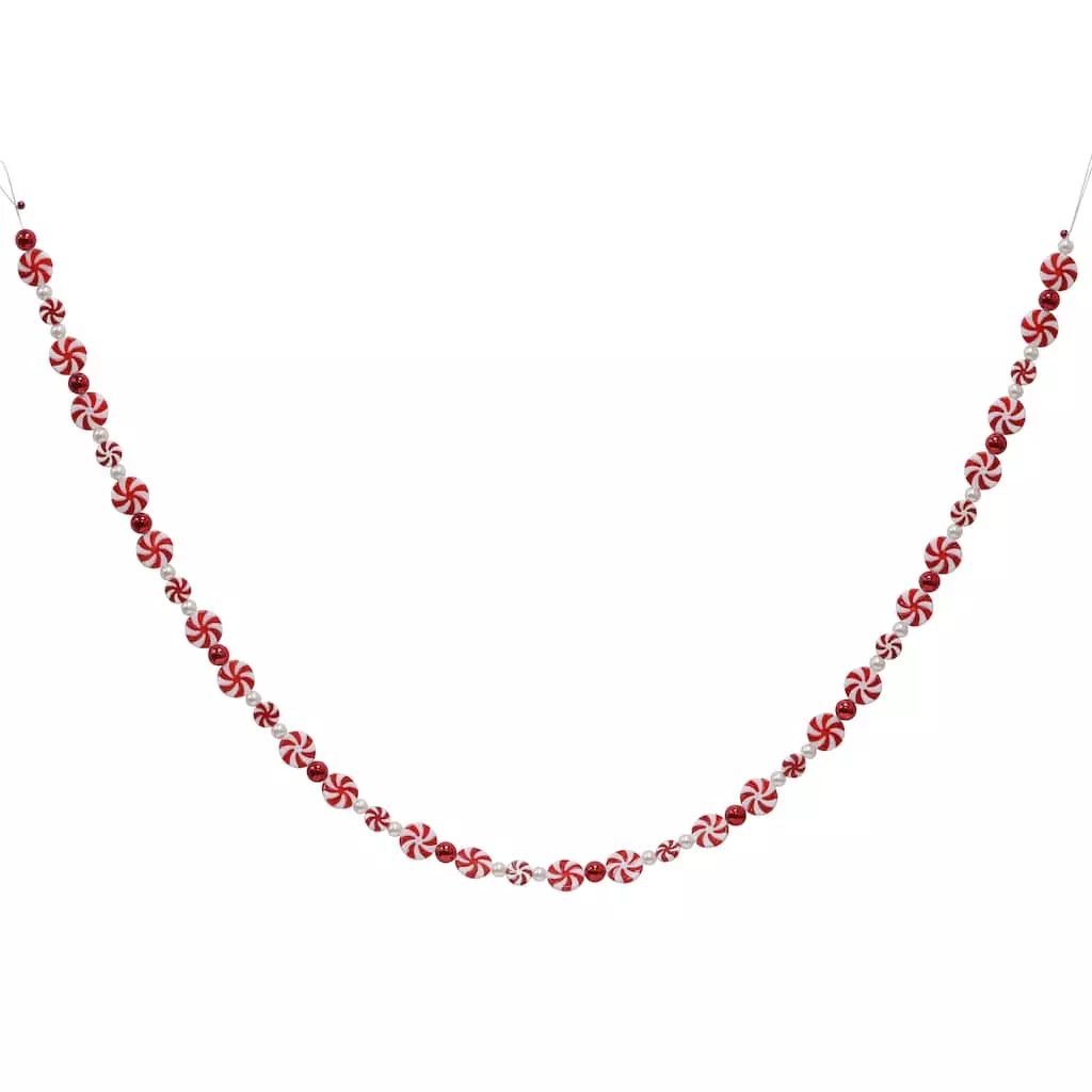 Bring a touch of Christmas magic to your decorating with this playful garland of round red and white peppermint candies and shiny beads. This fun string makes a great addition to your tree, or drape over a doorframe, mantel or bannister paired with lights and ribbon for a festive display full of holiday cheer.