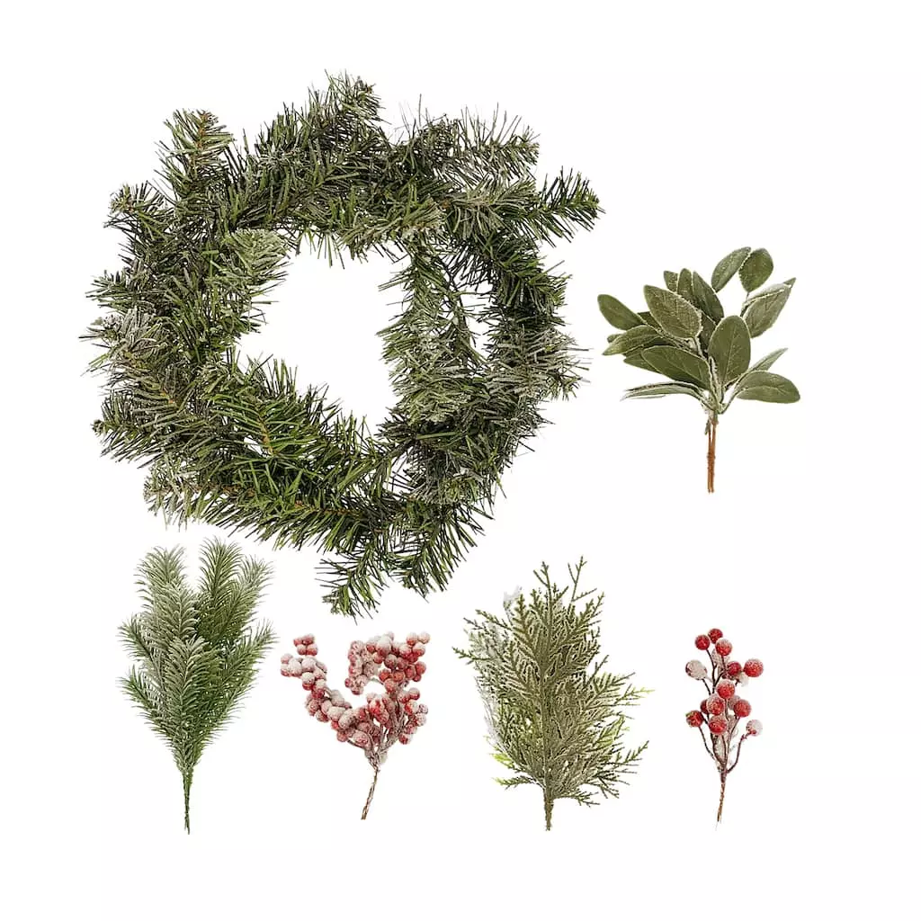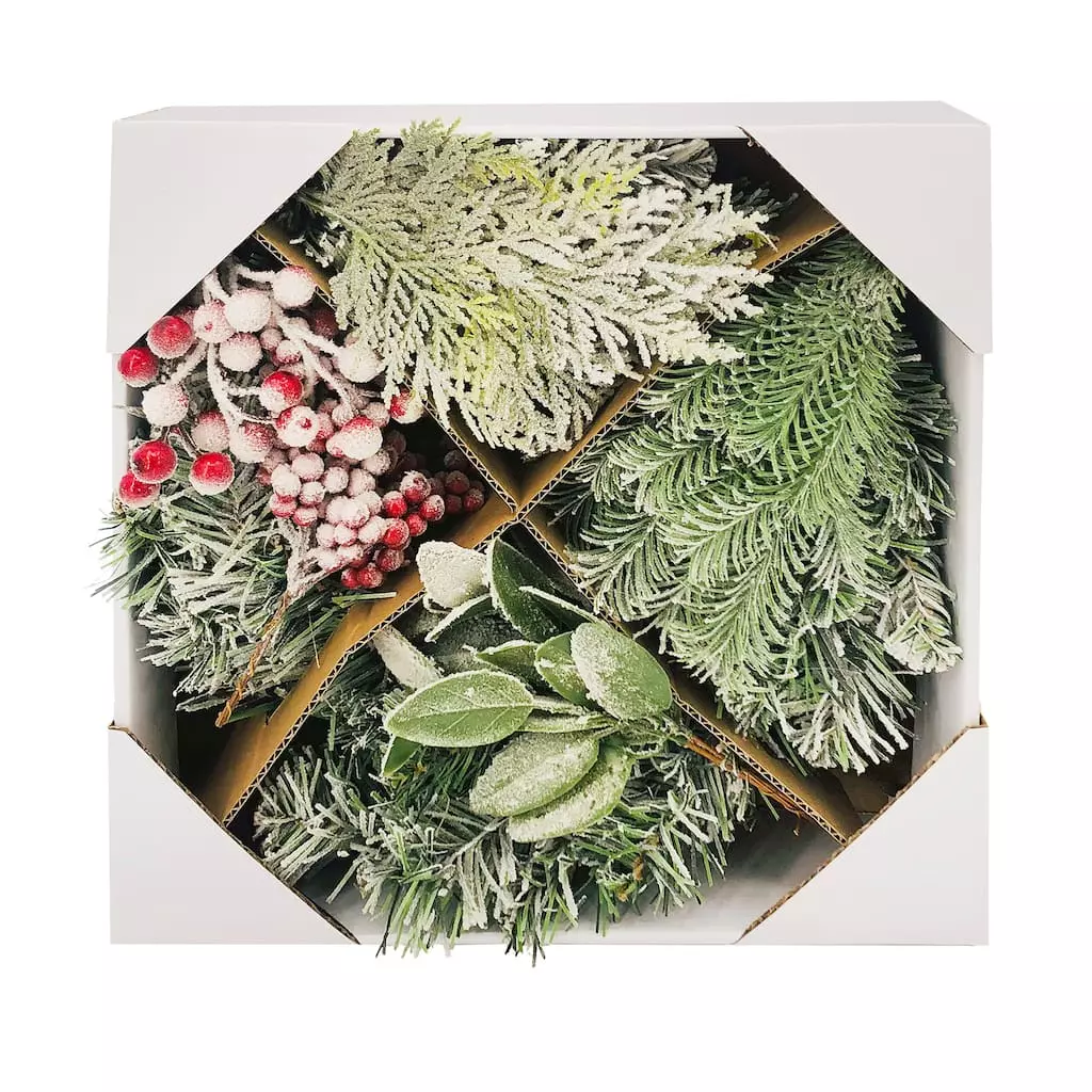 - 1 snowy pine wreath base with 2 types of snowy pine picks