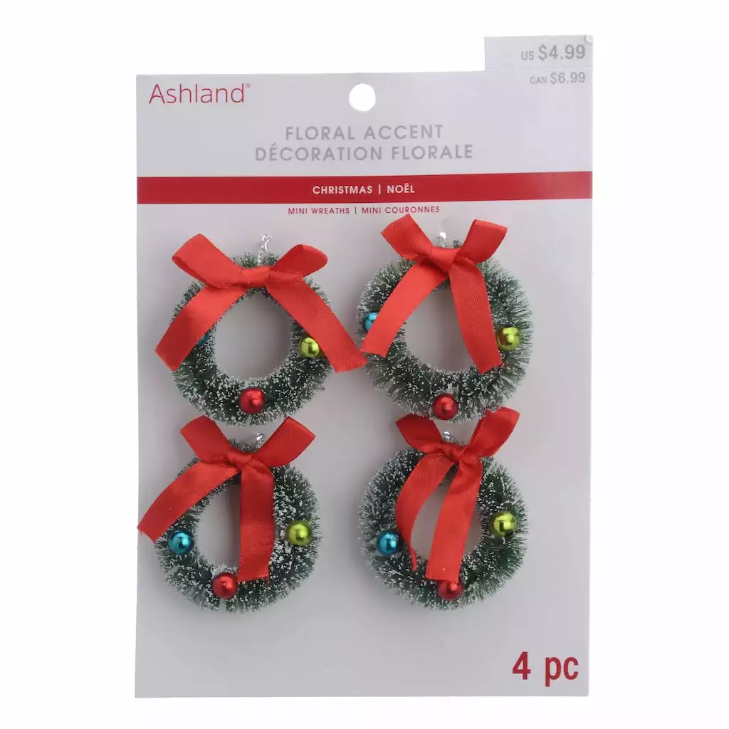 Hang these tiny wreaths on your Christmas tree to add bright sparkle to your holiday dΓ©cor. The bright red bow and ball ornaments will go with any traditional decorations.