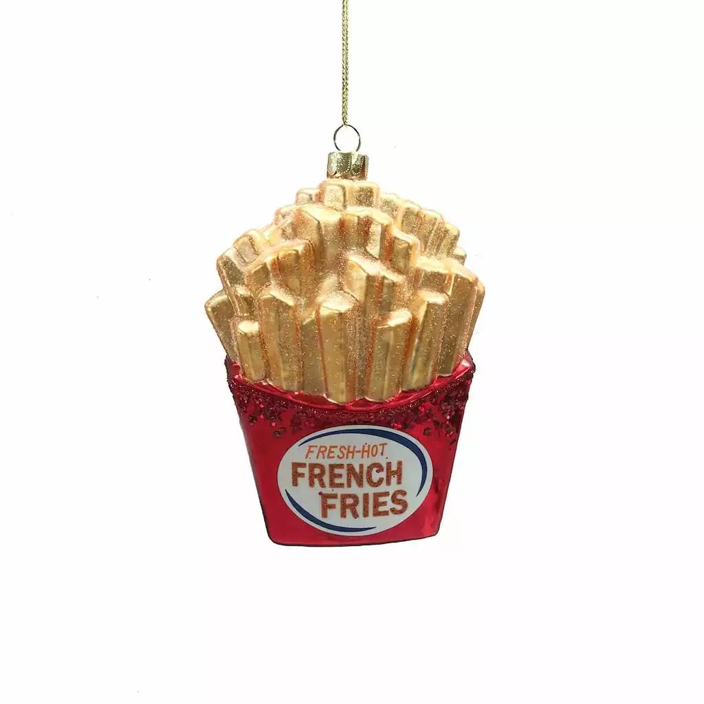 Add this savory french fries ornament to your holiday decorations. Hang it for display on a Christmas tree or ornament stand.