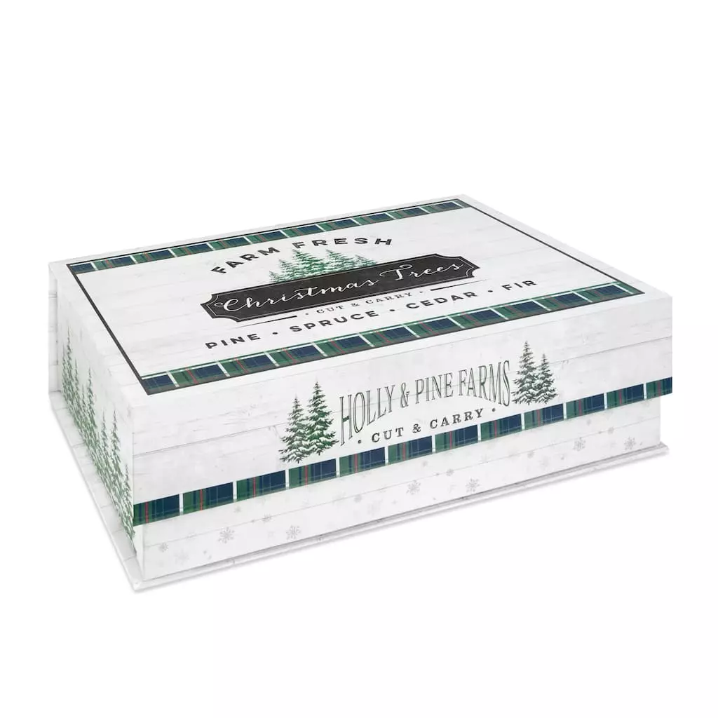 This flip top decorative box is the perfect piece for your home dรฉcor and storage. It features “Farm fresh Christmas trees” and a seasonal design with trees.