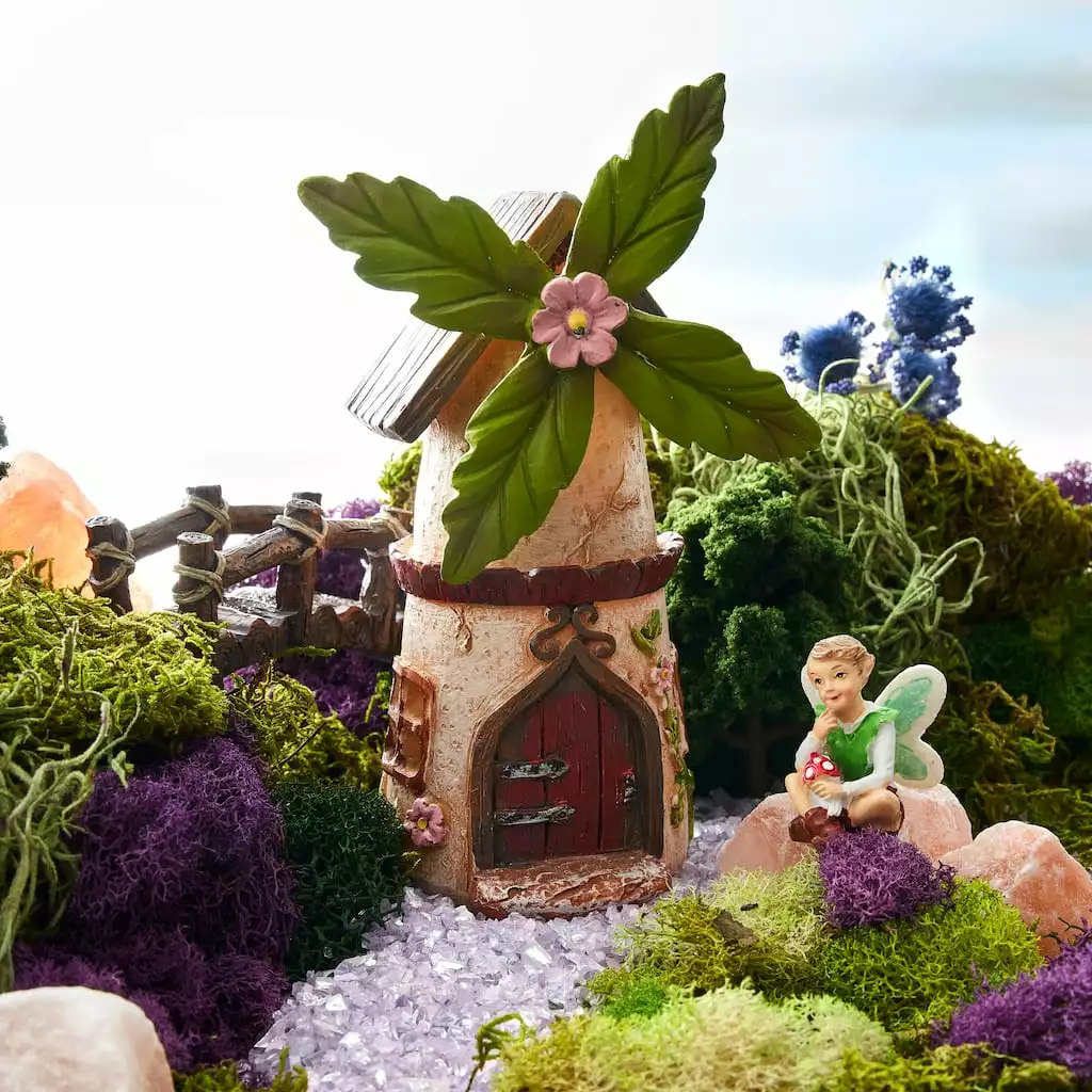 Add a lovely home to your fairy garden with this miniature light up windmill house. Featuring charming details and adorned with flowers and greenery, pair this wonderful structure with greenery, friendly critters and a fairy or two.