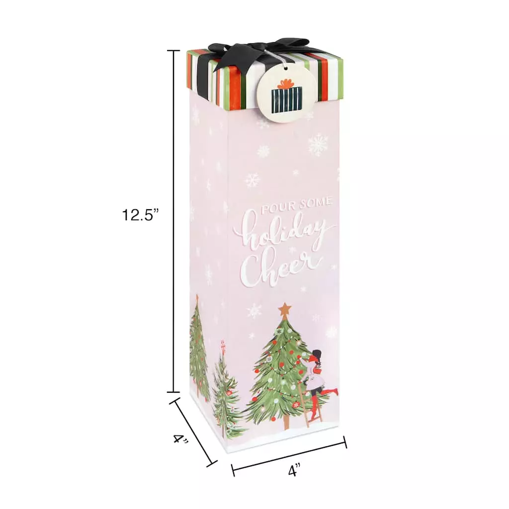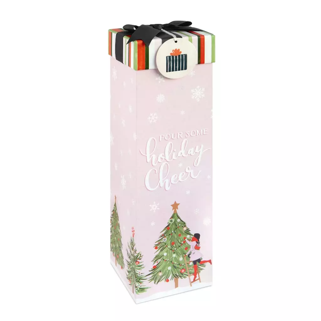 Featuring a fun design of fashionistas decorating for the holidays, this charming box is a fantastic way to dress up your holiday beverage gifts with festive flair. With a pretty black bow and coordinating tag, use to hold a special gift sure to stand out as you celebrate the Christmas season with your loved ones.
