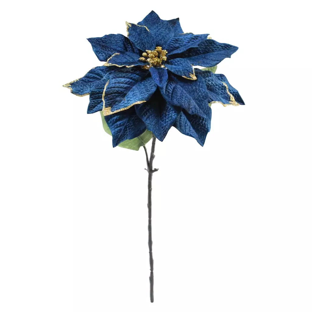 This navy and glittery gold edge poinsettia stem is perfect for adding to a seasonal DIY floral arrangement. Place it in a decorative container to display on your coffee table or counter.