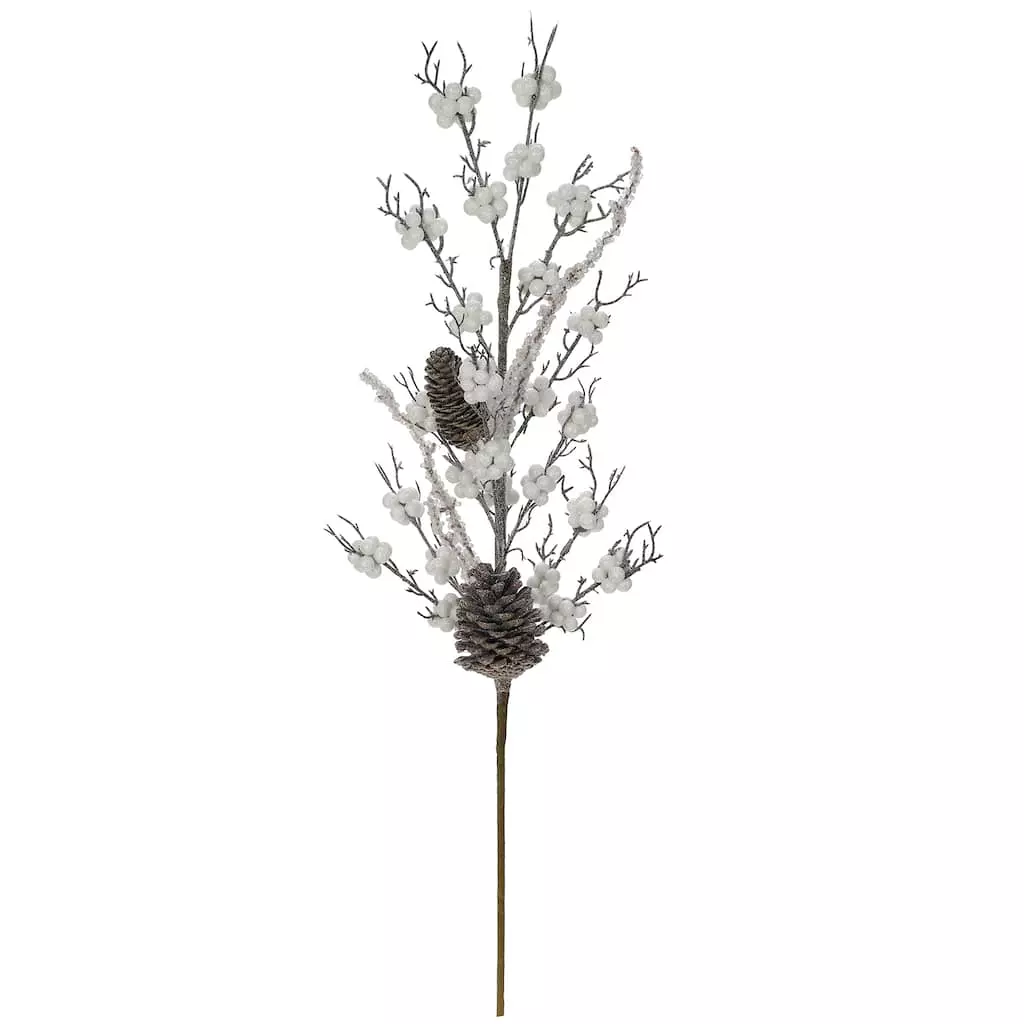 With frosty white berries and a dusting of glitter, this berry and pinecone stem will add a lovely shimmery touch to your Christmas floral projects. Use to bring depth to handmade wreaths and holiday décor or create a stunning arrangement along with frosted pine stems and brilliant red blooms in a tall vase.