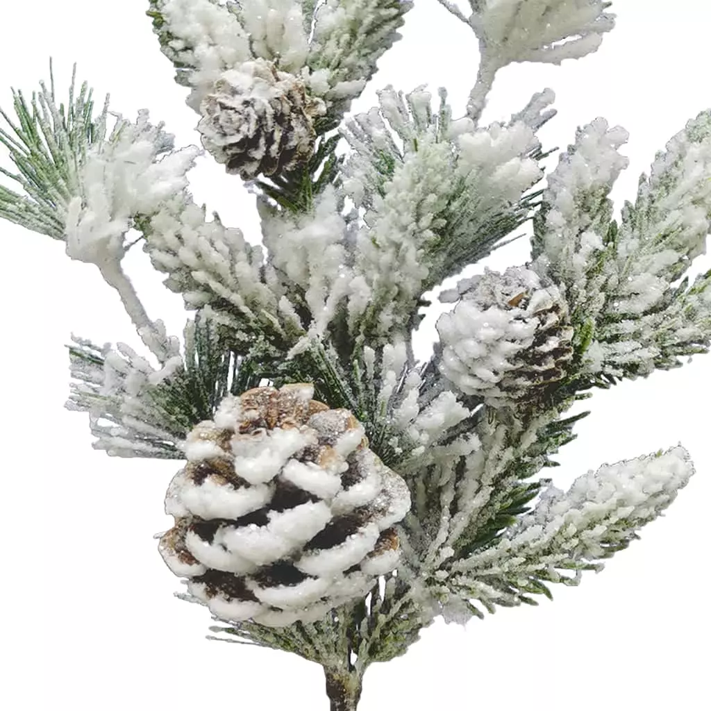 Give your wreaths and floral arrangements a lovely wintery touch with this snowy pine pick. With an icy finish and pinecone accents, this piece will pair beautifully with vibrant red blooms and evergreen branches in a ceramic vase to create a festive Christmas display for your mantel or entryway table.