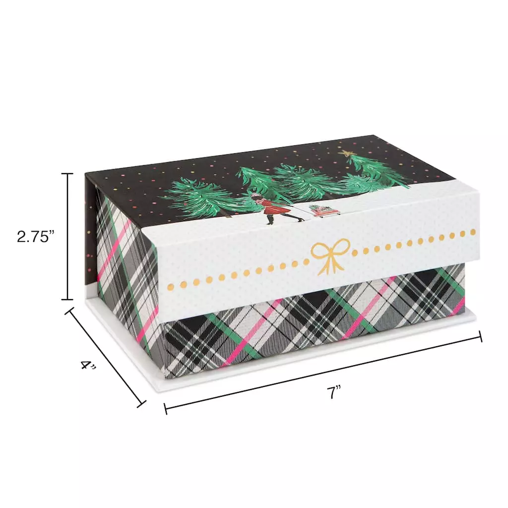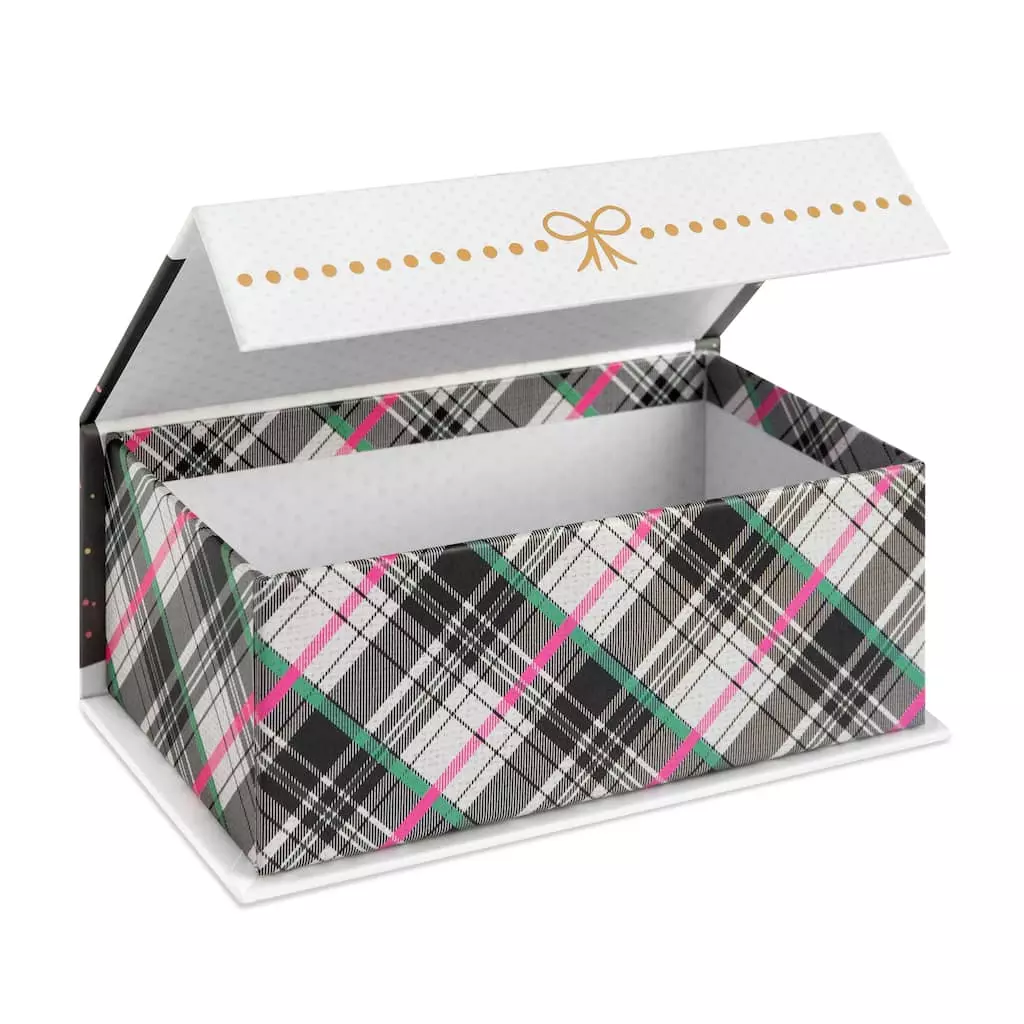 This flip top decorative box is the perfect piece for your home décor and storage. It features a seasonal design with a winter scene and a plaid design on the flap.